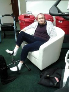 Our Occupational Therapist tries new exercises for individuals to continue strength building and maintaining physical health. Here we have Linda W. using the freestanding pedals and James P. on the exercise bike.